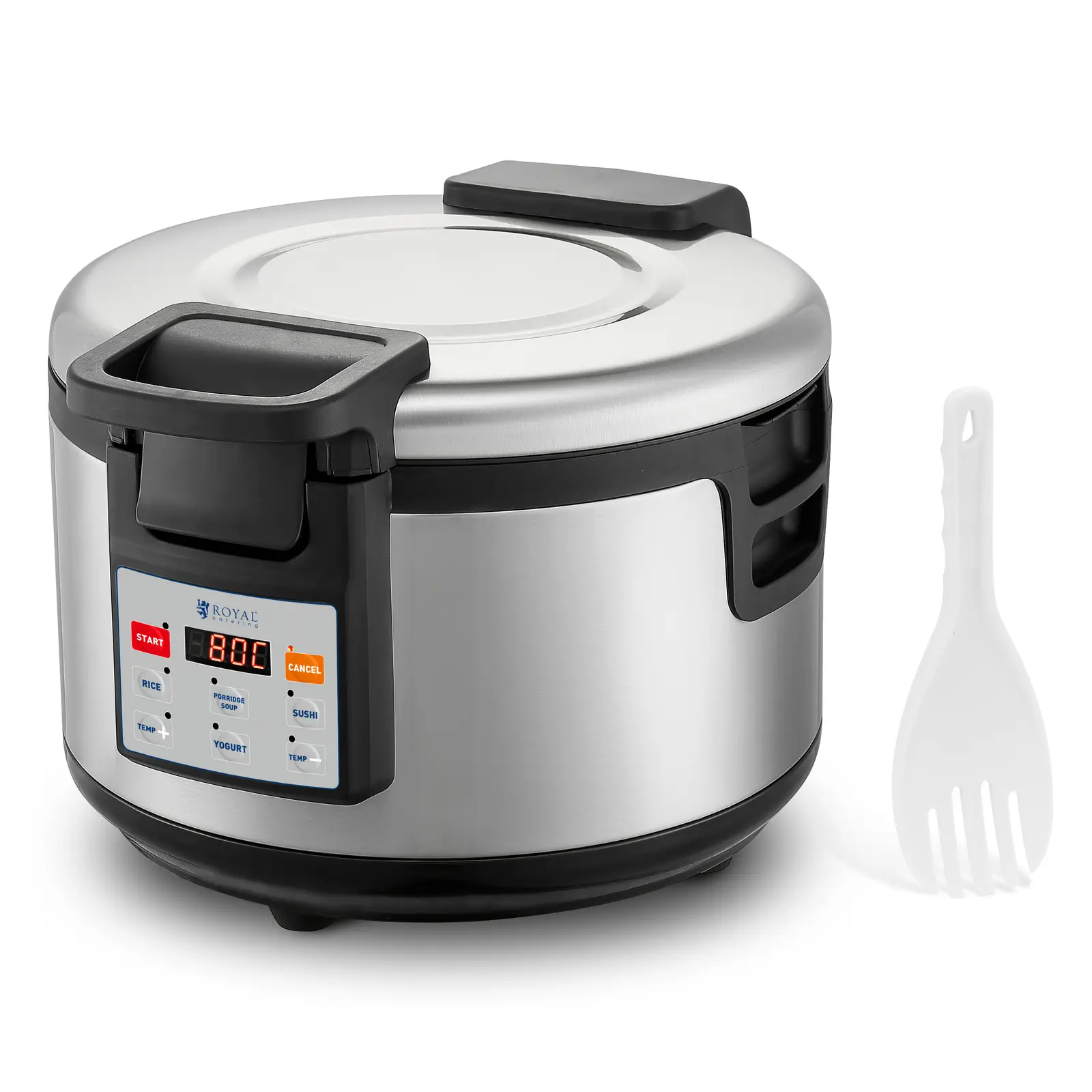 Управлението на уреда за затопляне на ориз става удобно и прегледно чрез цифровото управление с ясна индикация на програмата. Изва可емият вътрешен съд с незалепващо покритие минимизира усилията за почистване и предотвратява залепването дори при деликатни ястия. Термоустойчивите дръжки осигуряват безопасно боравене – дори при високи температури или пълен съд. Включената лъжица за ориз улеснява порционирането. Независимо дали за по-големи количества ориз, кремообразна каша или домашно приготвен йогурт: уредът за затопляне на ориз от Royal Catering впечатлява с висока капацитет, модерна технология и удобна за потребителя екипировка.